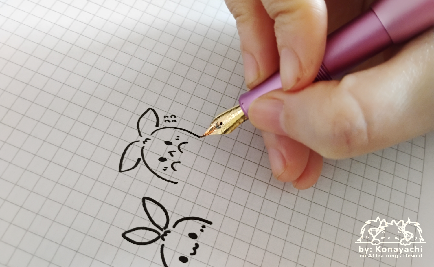 First, it glides the smoothest in my sketchbook: the sketchbook that hates all my other fountain pens. Second, its 'Bent Nib' behaves way, way better than Sailor Profit Fude Nib – it bends less, and is more wet in general. Thin lines, thick lines, they are all super smooth! ✨ It's super fun doodling with this pen!