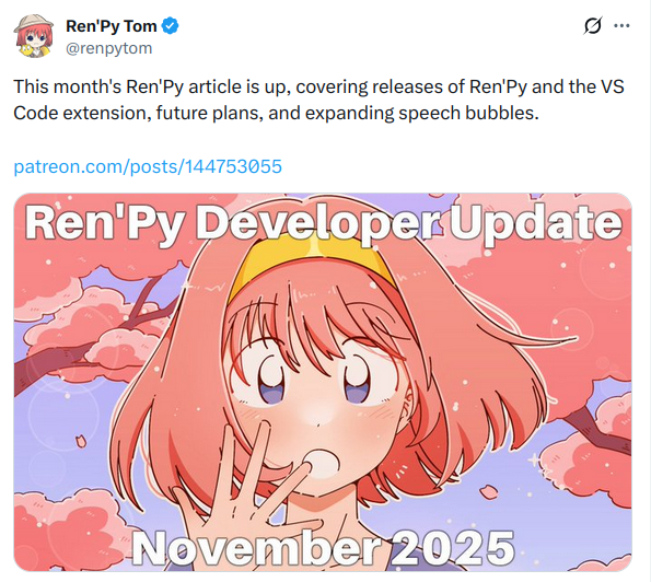 — Ren'Py Tom (@renpytom) November 30, 2025